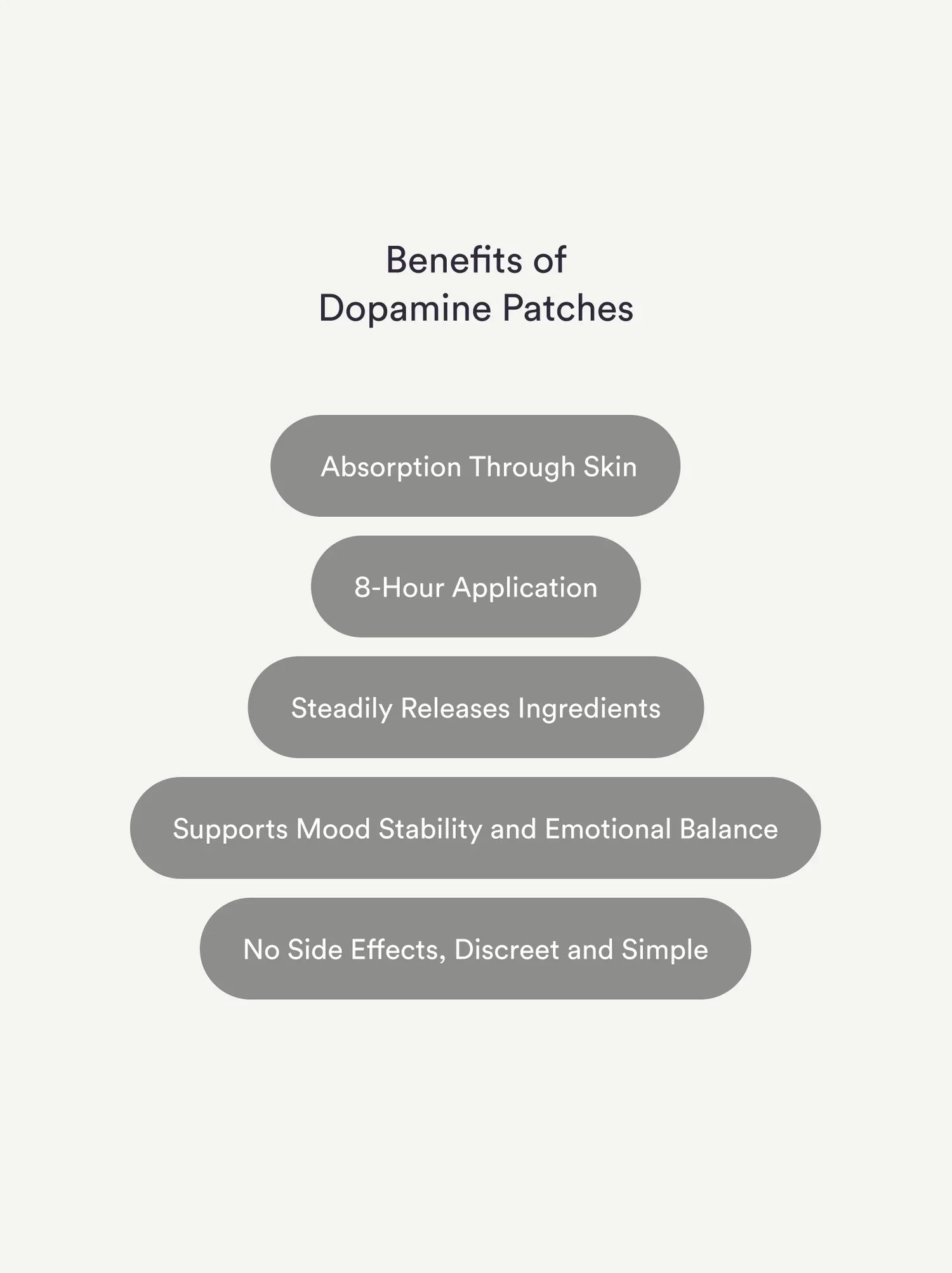Each Dopamine Patch provides steady, sustained support for up to 8 hours. Simply apply the patch to clean, dry skin, and enjoy all-day benefits.