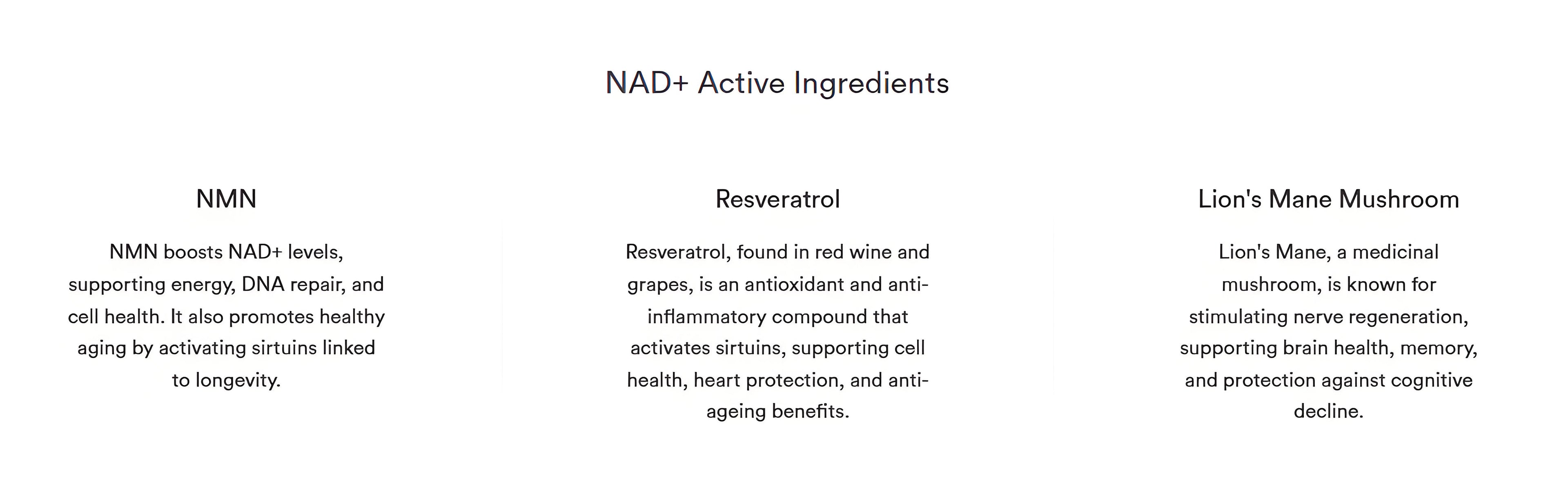"As we age, our NAD levels naturally decrease. By the time we are 40, NAD levels drop by 50% and continue to decline every decade. The solution: to boost NAD levels."